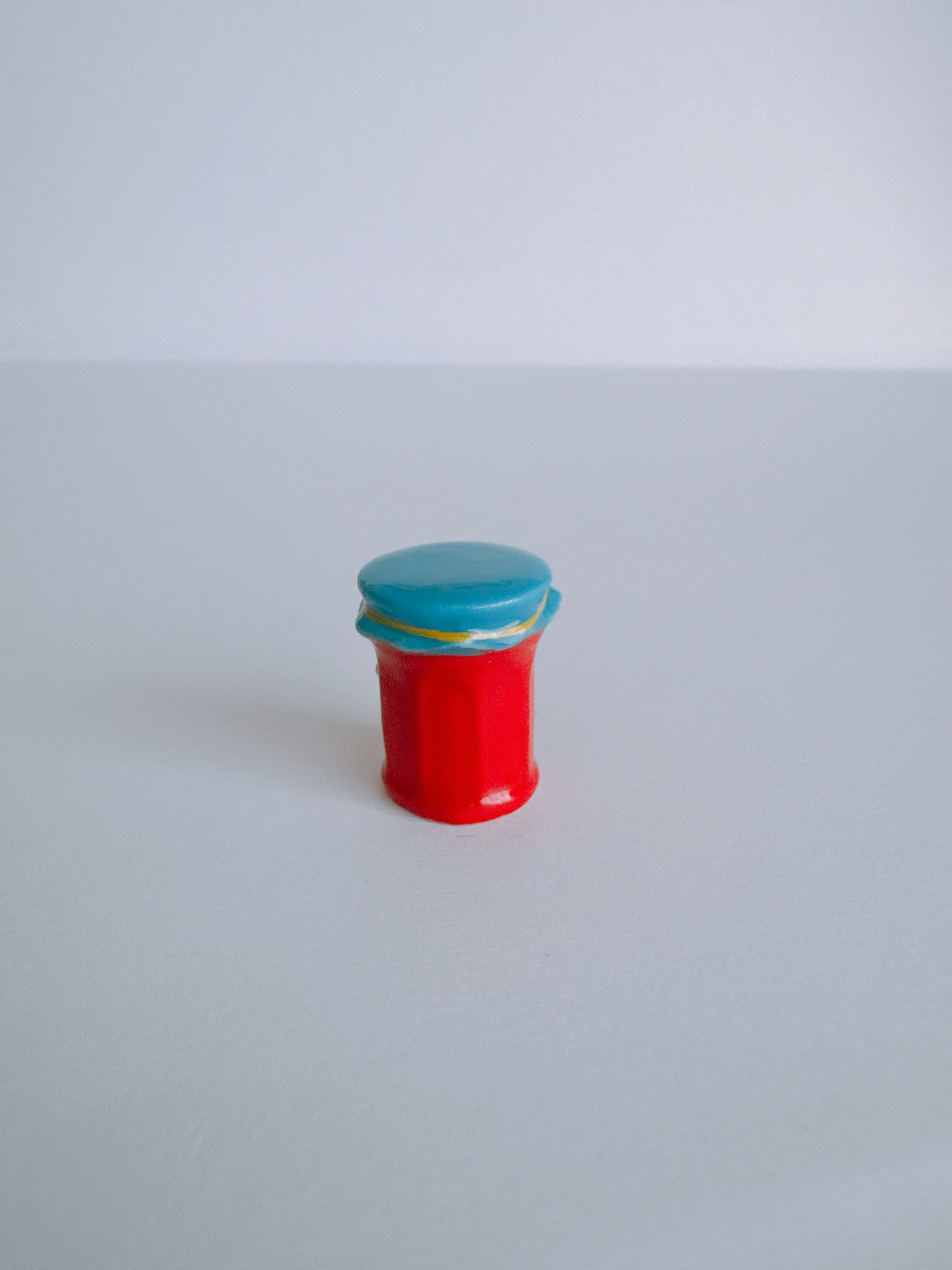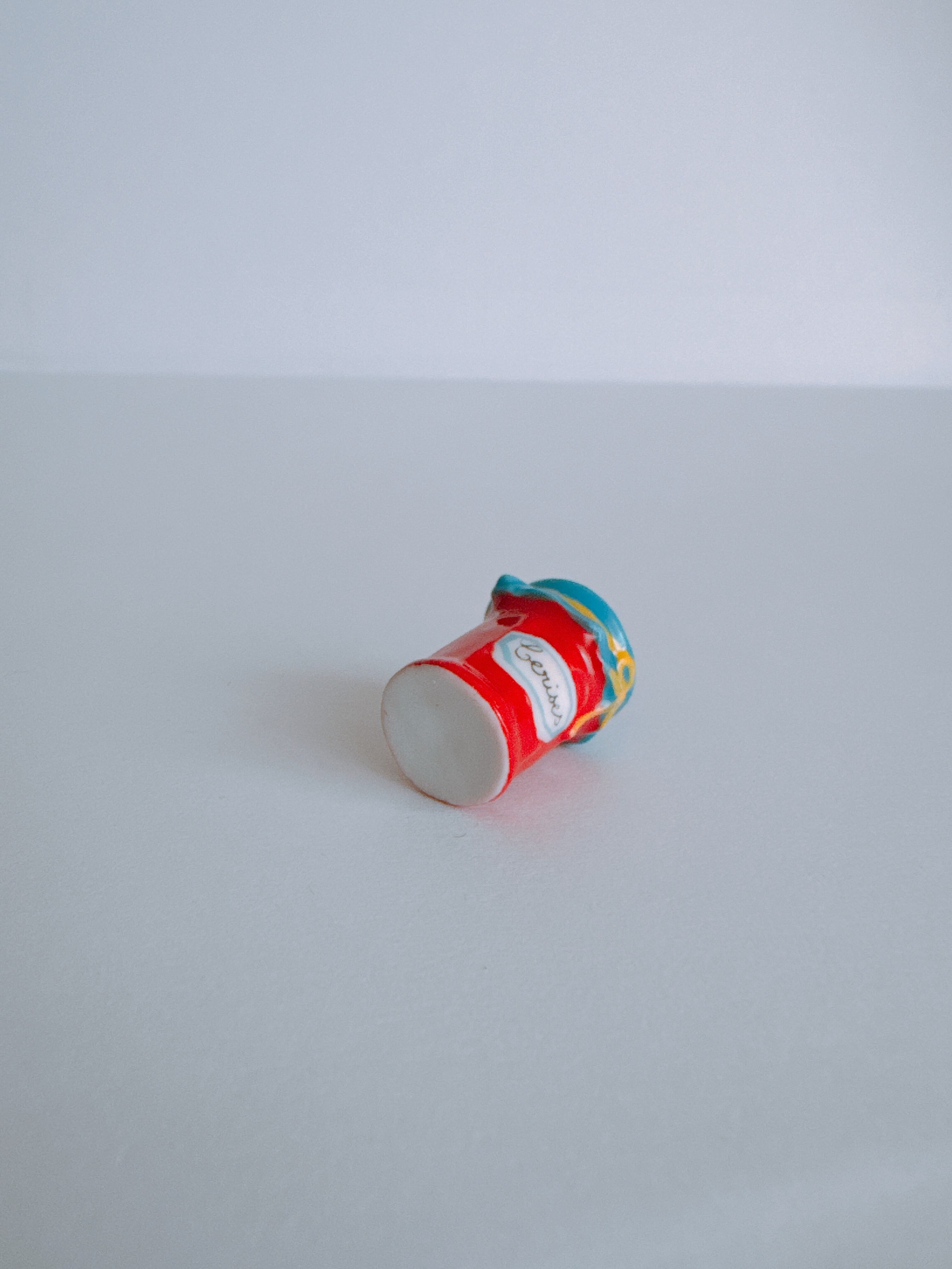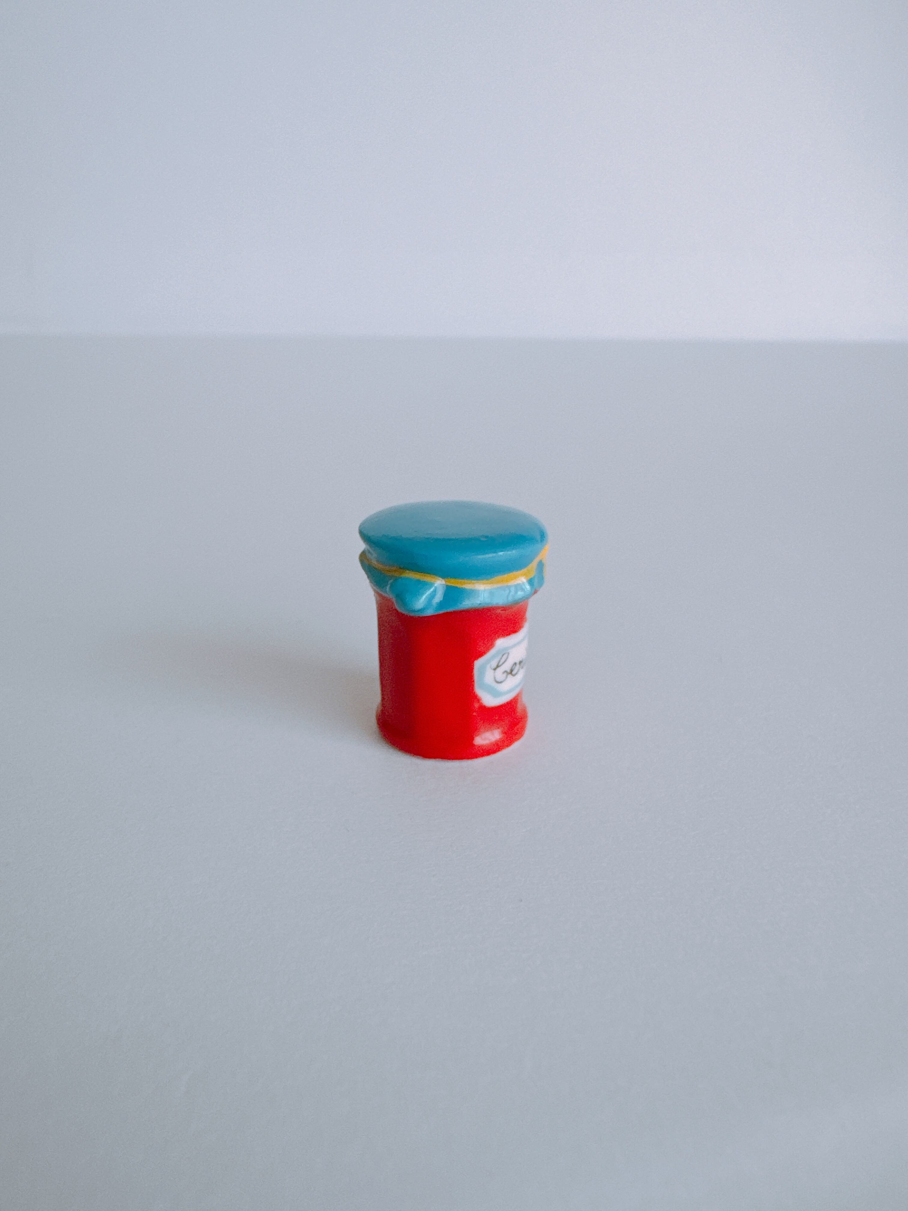 さくらんぼのコンフィチュールをモチーフにしたフェーヴ。赤い瓶にブルーのふた、黄色いリボンの装飾が可愛らしいデザインです。