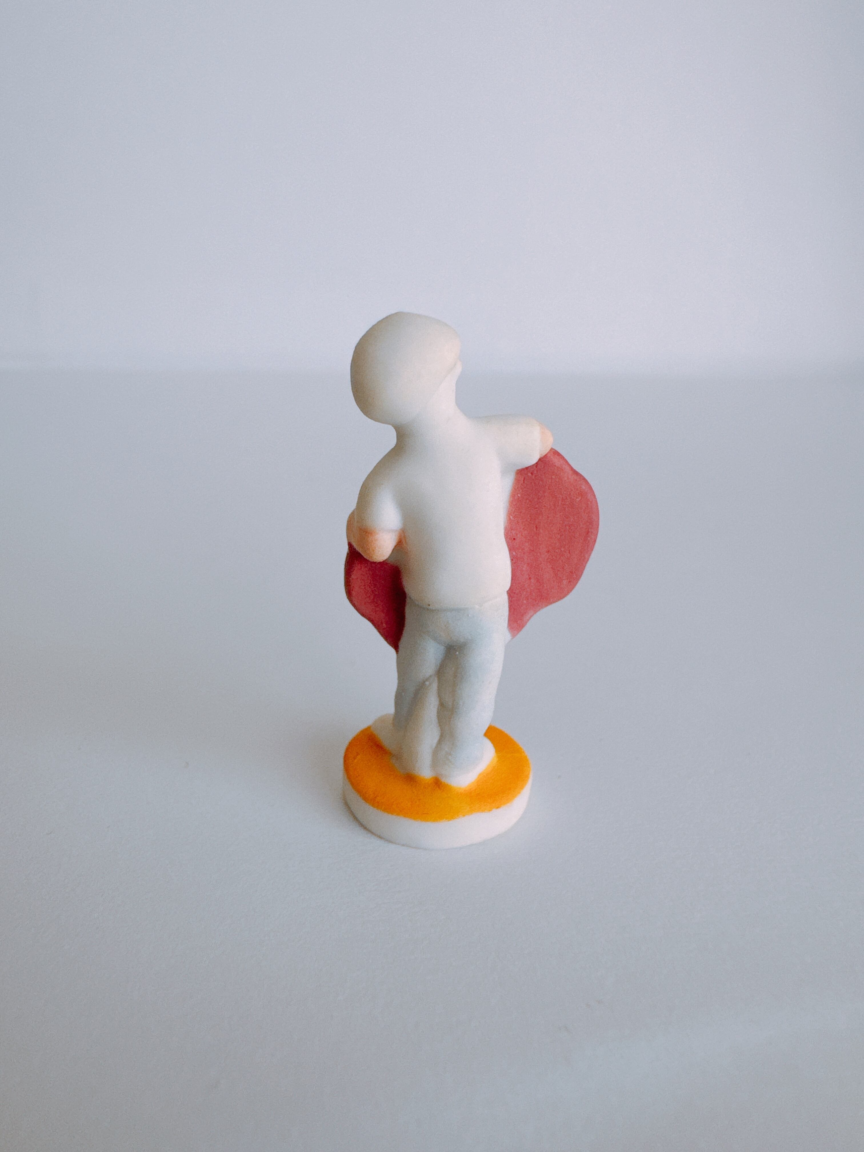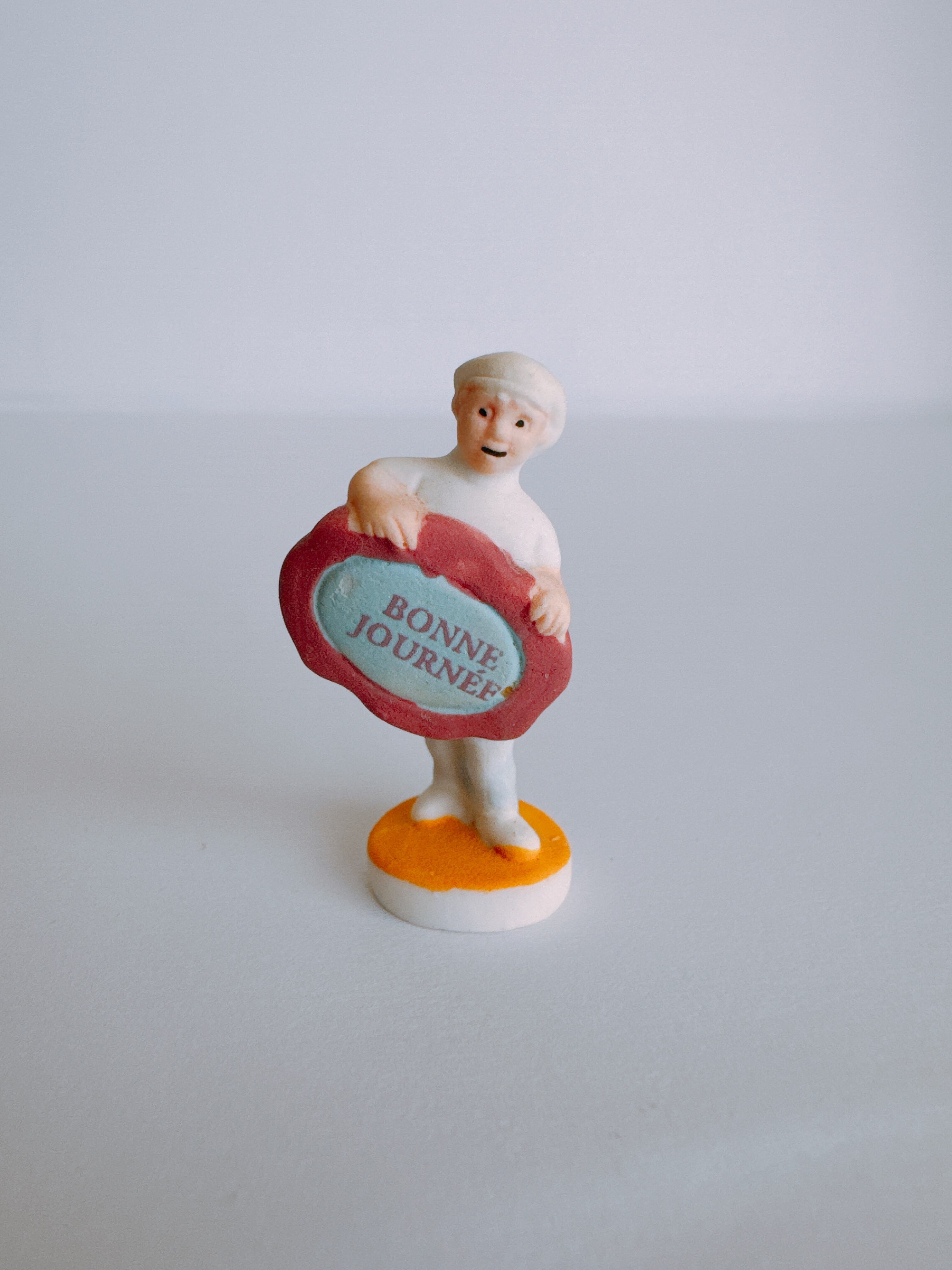 “Bonne Journée(良い一日を)”と書かれたプレートを持つ人物のフェーヴ。