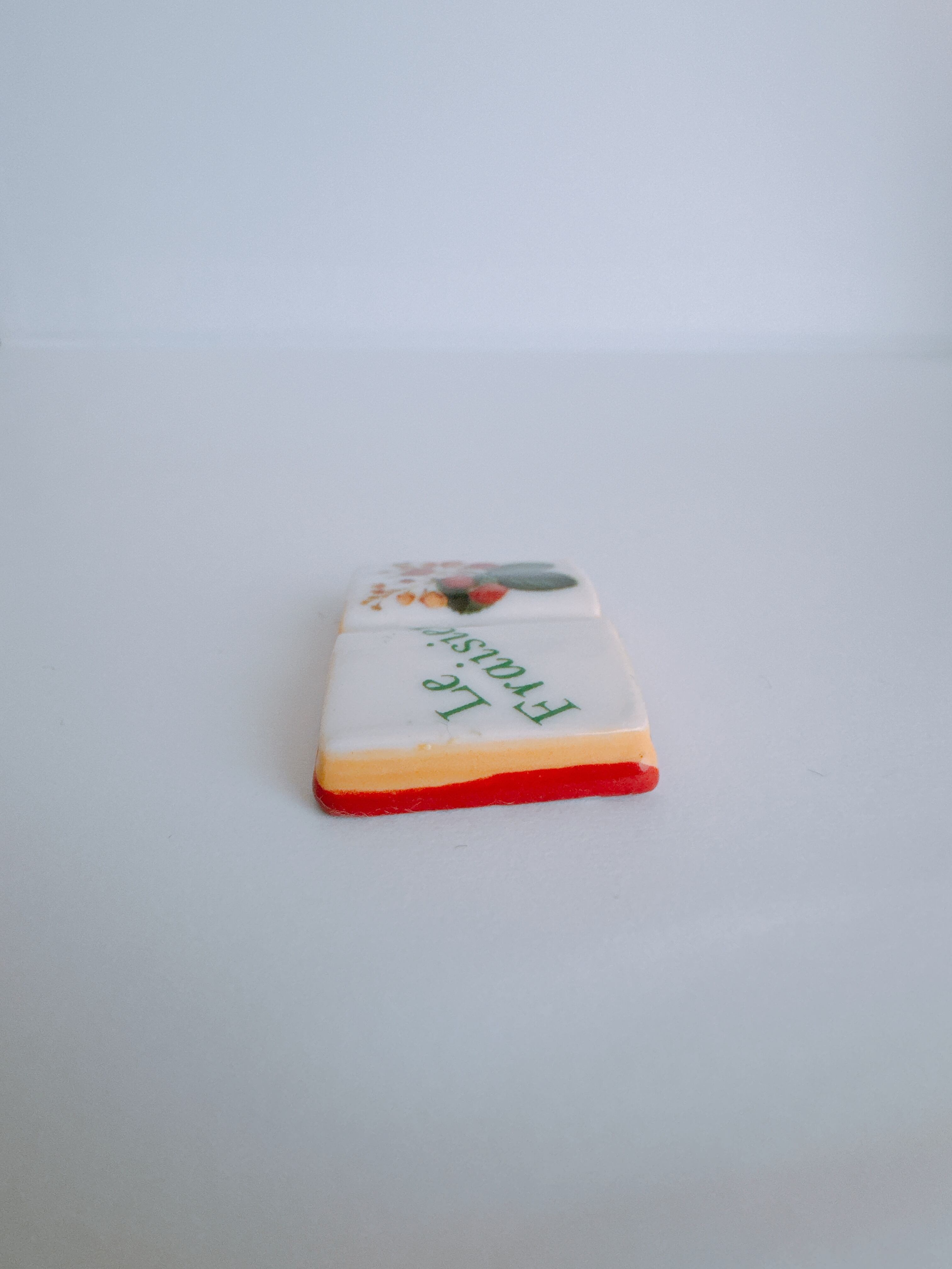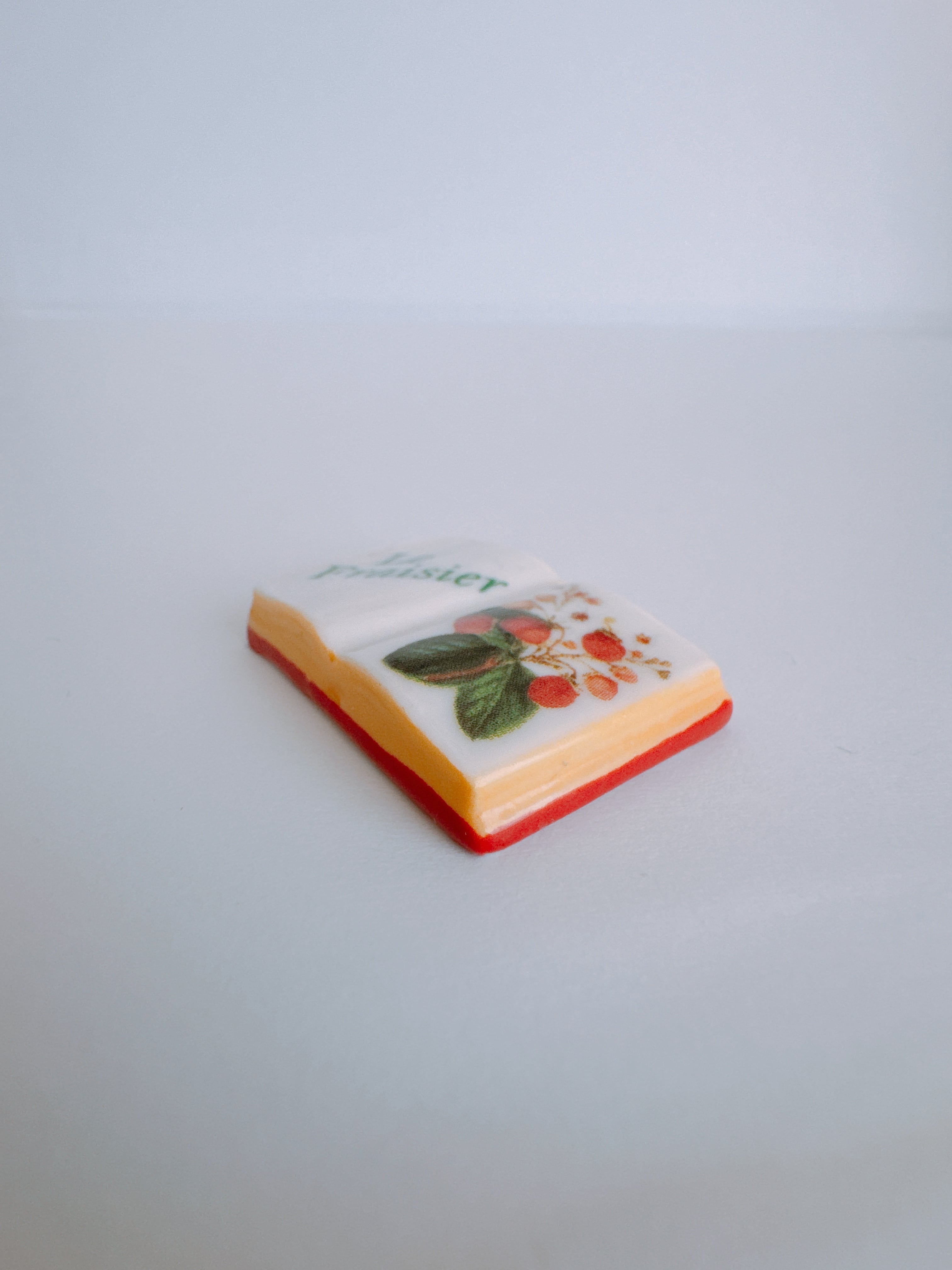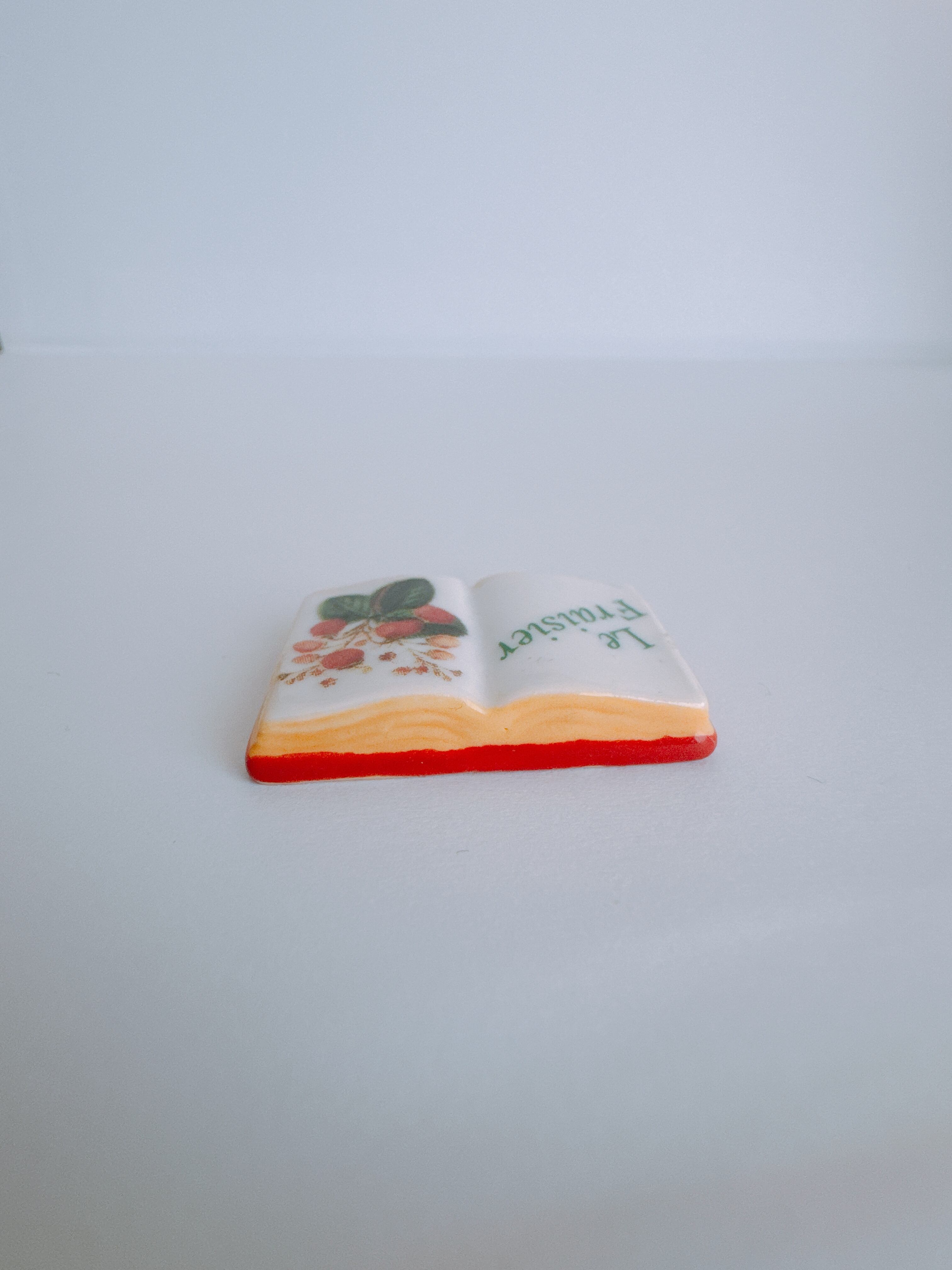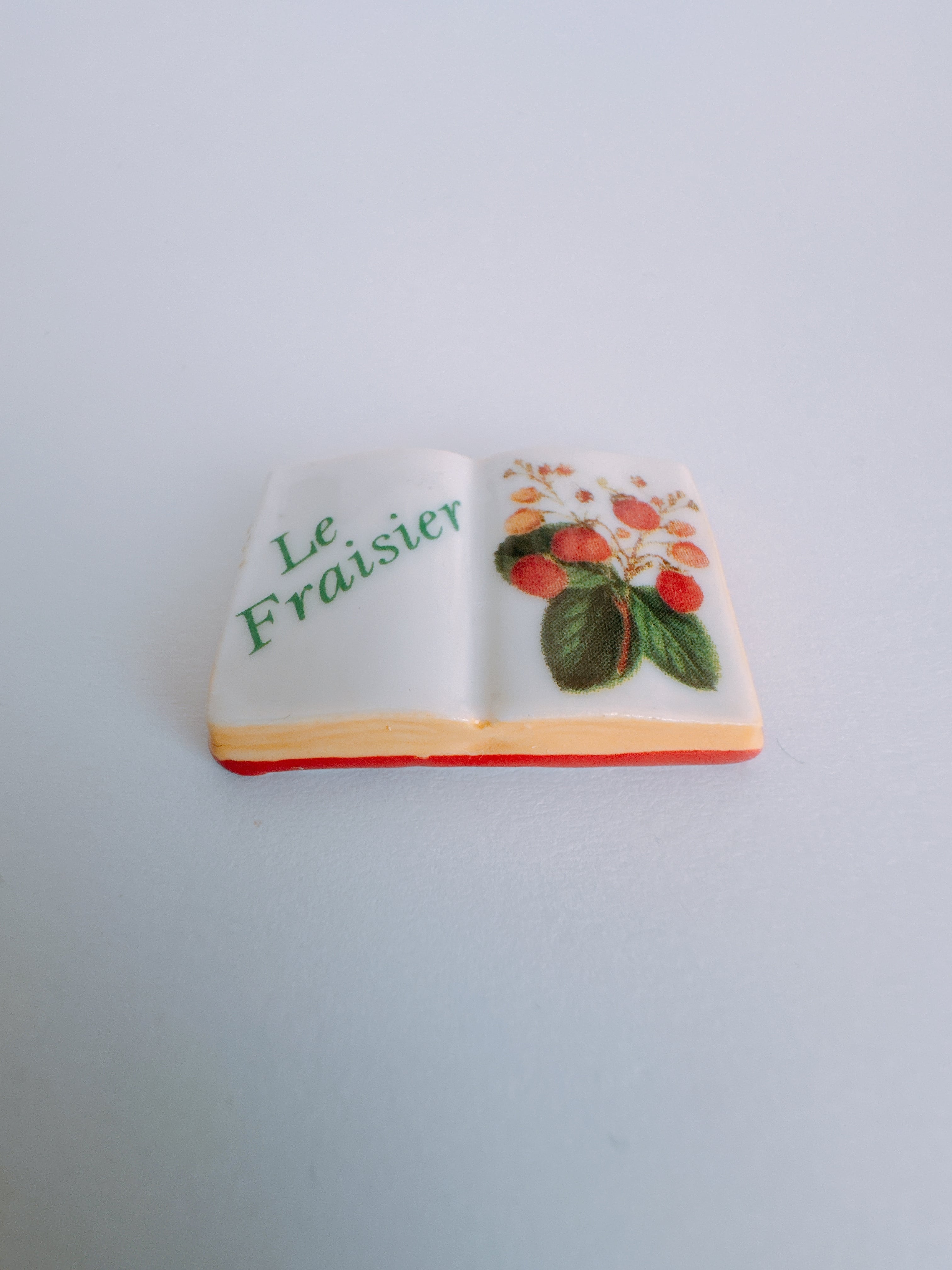 いちごについて紹介する小さな本をモチーフにしたフェーヴ。