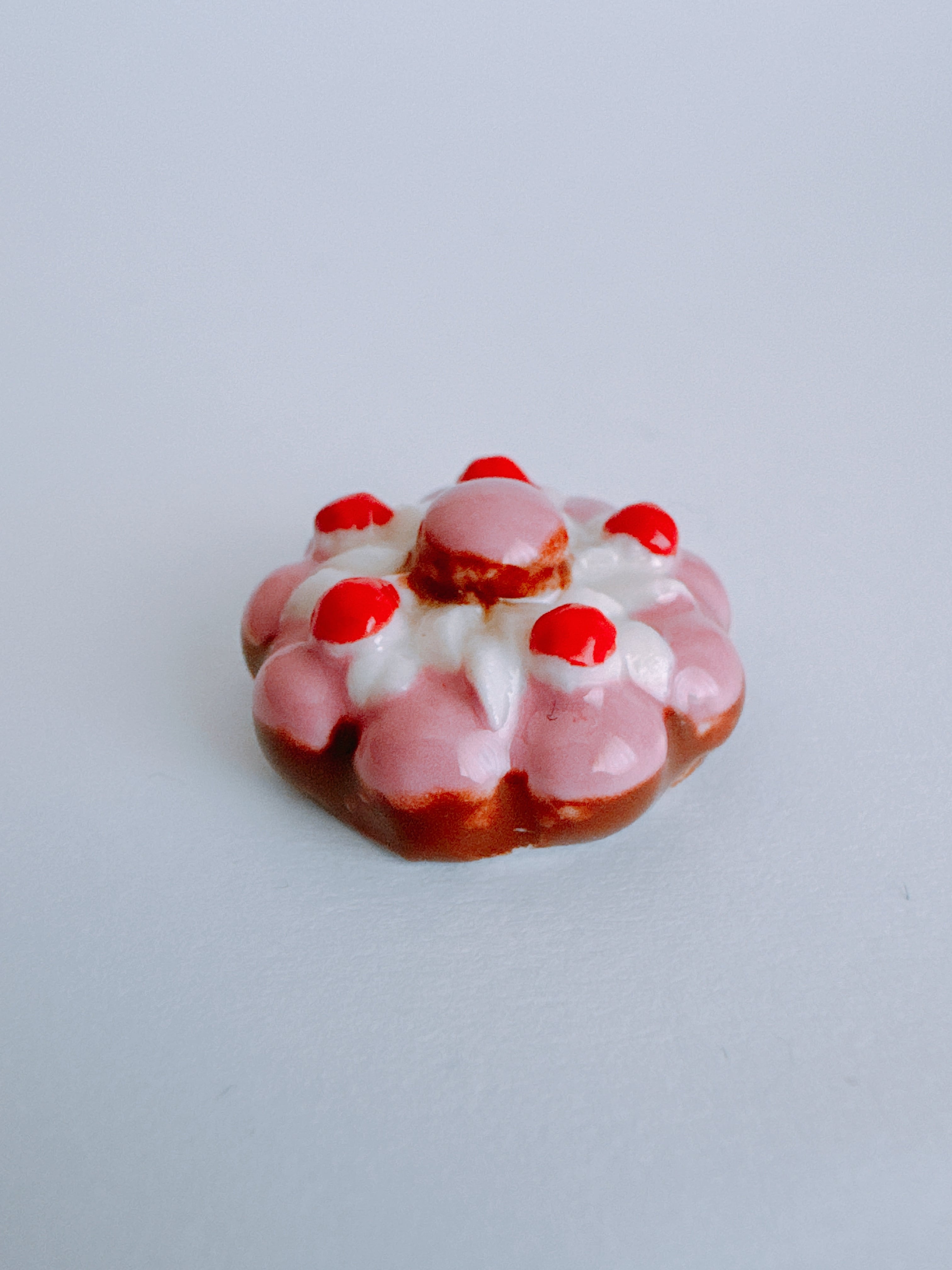 やわらかなピンクと赤で表現した可愛い苺の装いが印象的な特別なケーキフェーヴ。