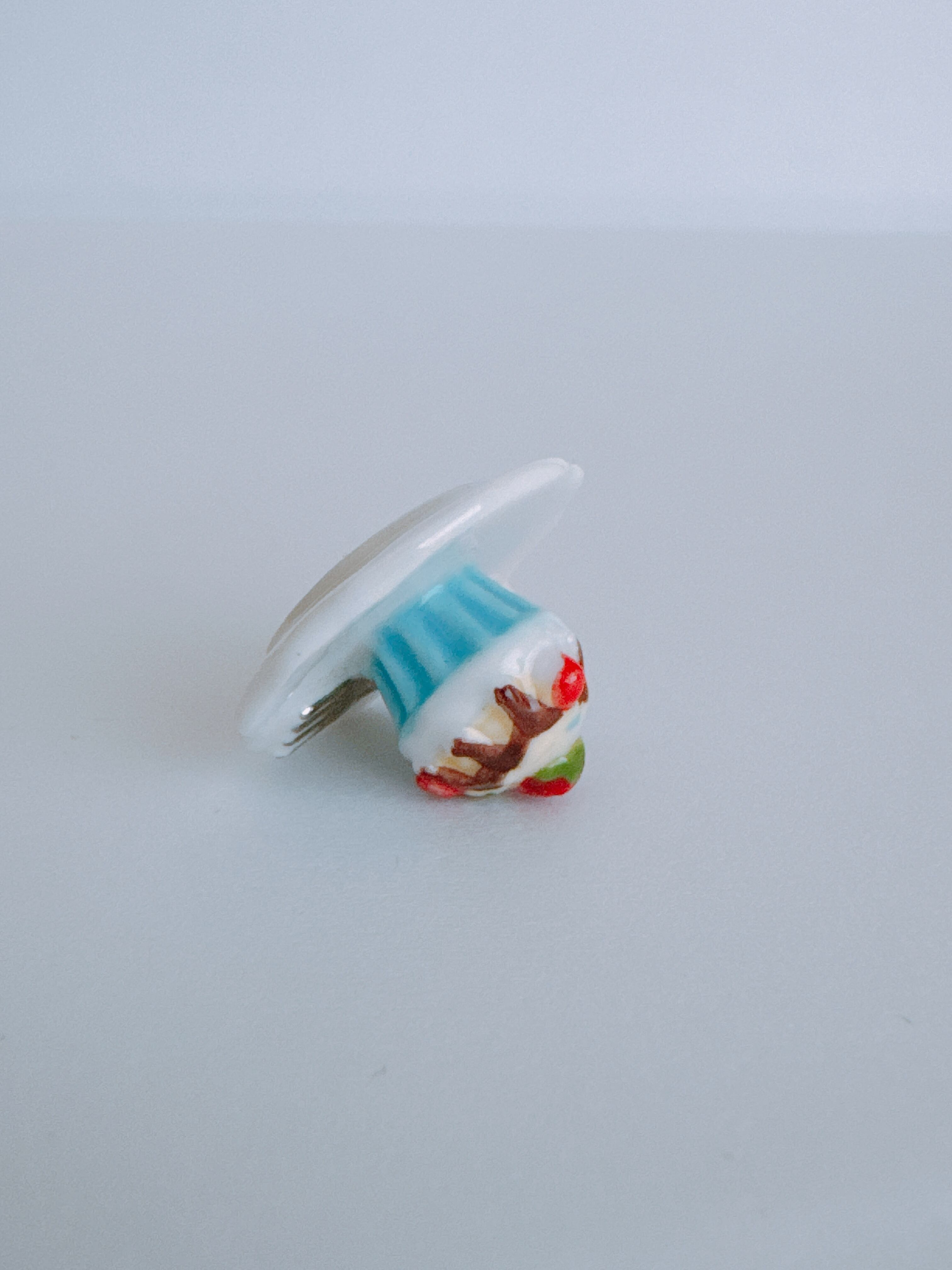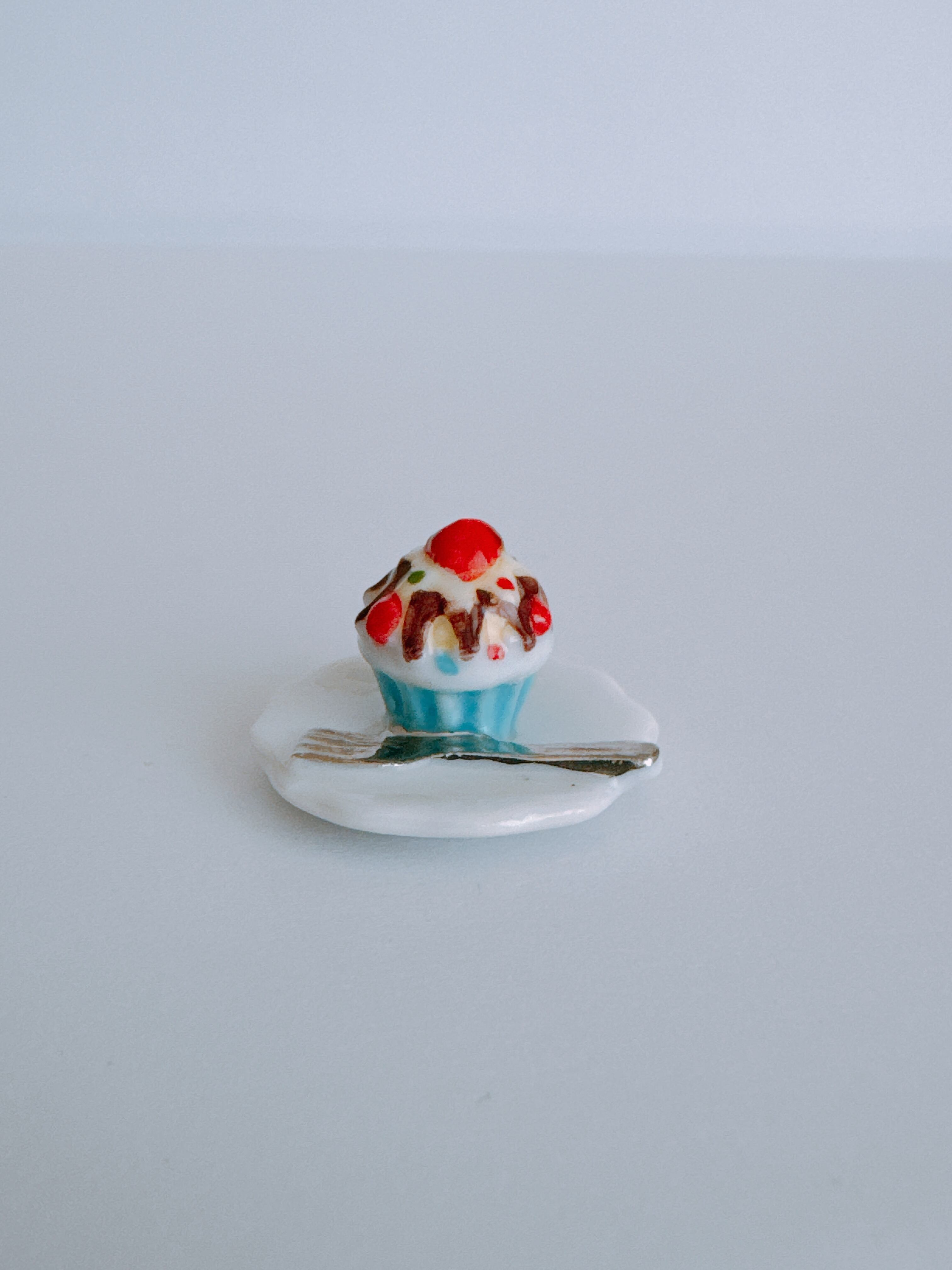クリームやフルーツ、チョコソースが豪華にトッピングされたカップケーキ。