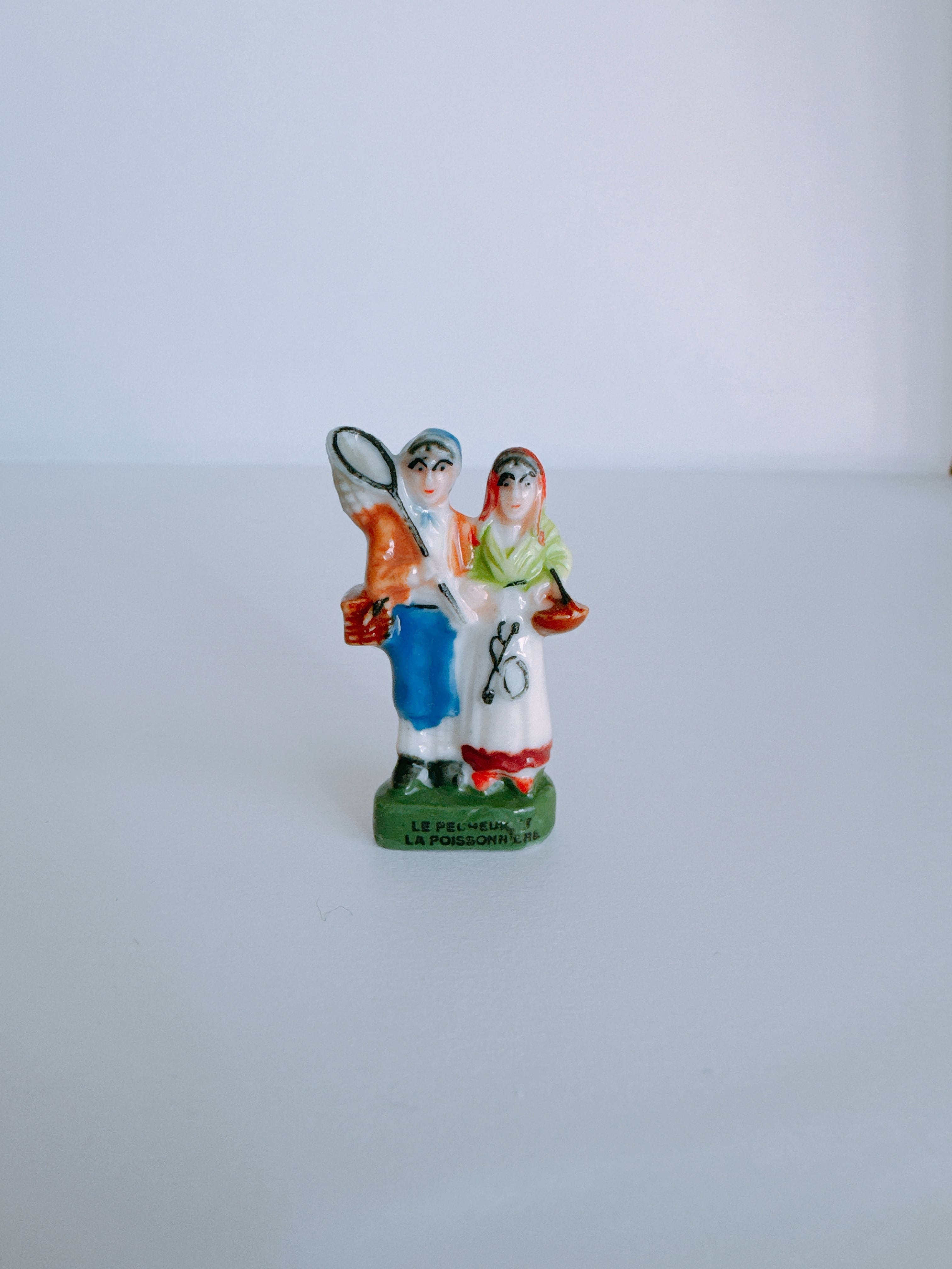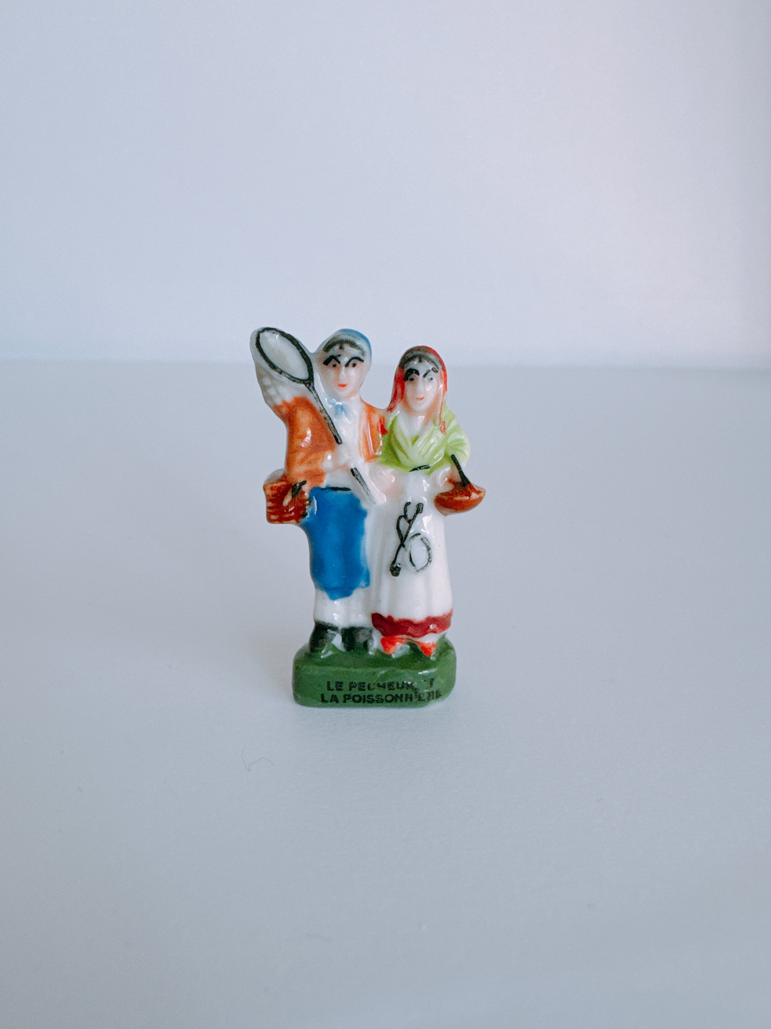 網を手にした漁師と、寄り添う女性の温かな情景。