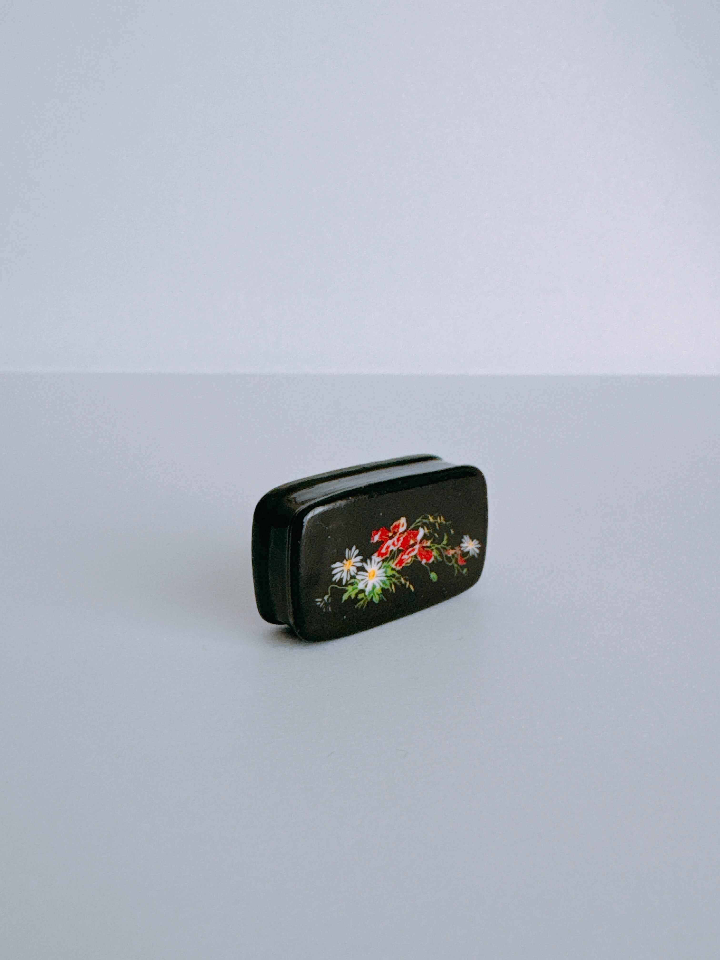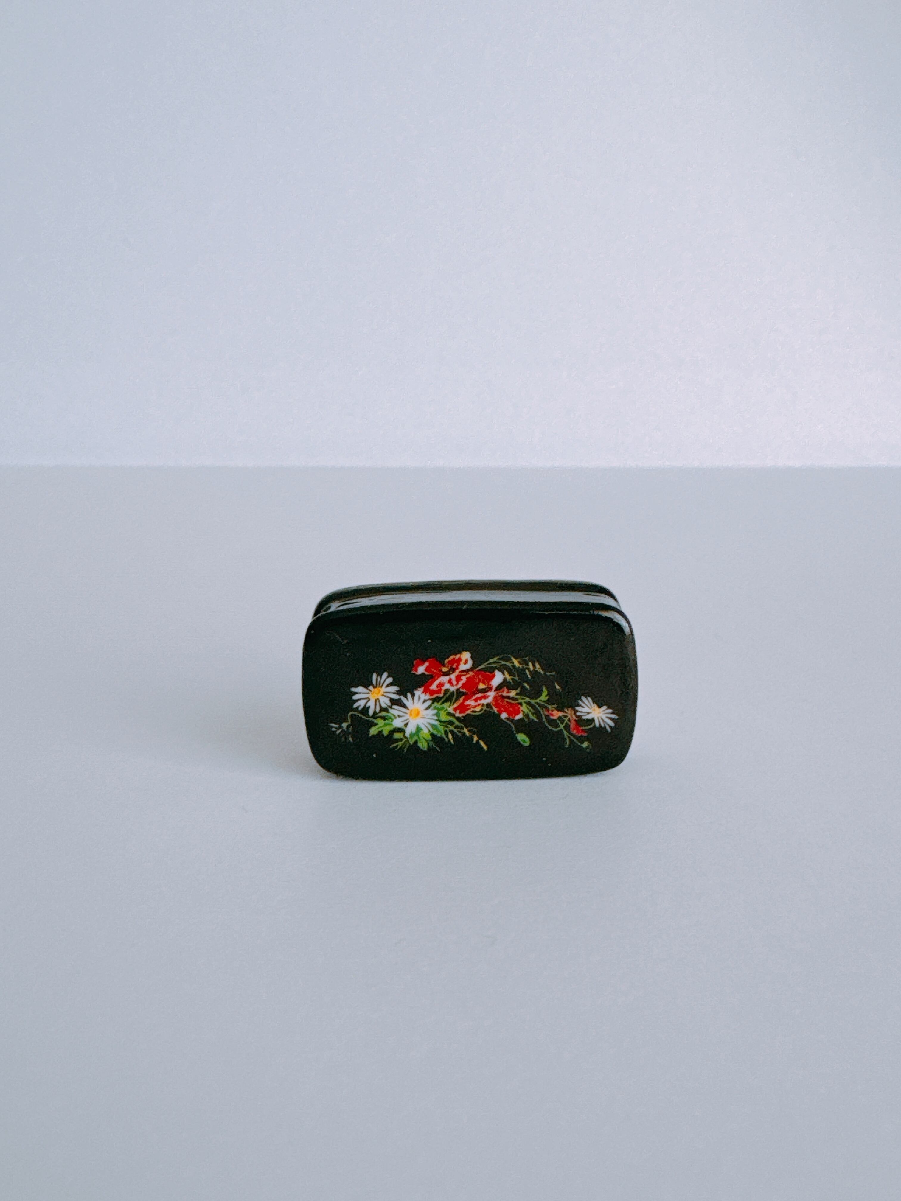 黒地に浮かぶ赤い花々が、やわらかな華やぎを添える小箱のフェーヴ。