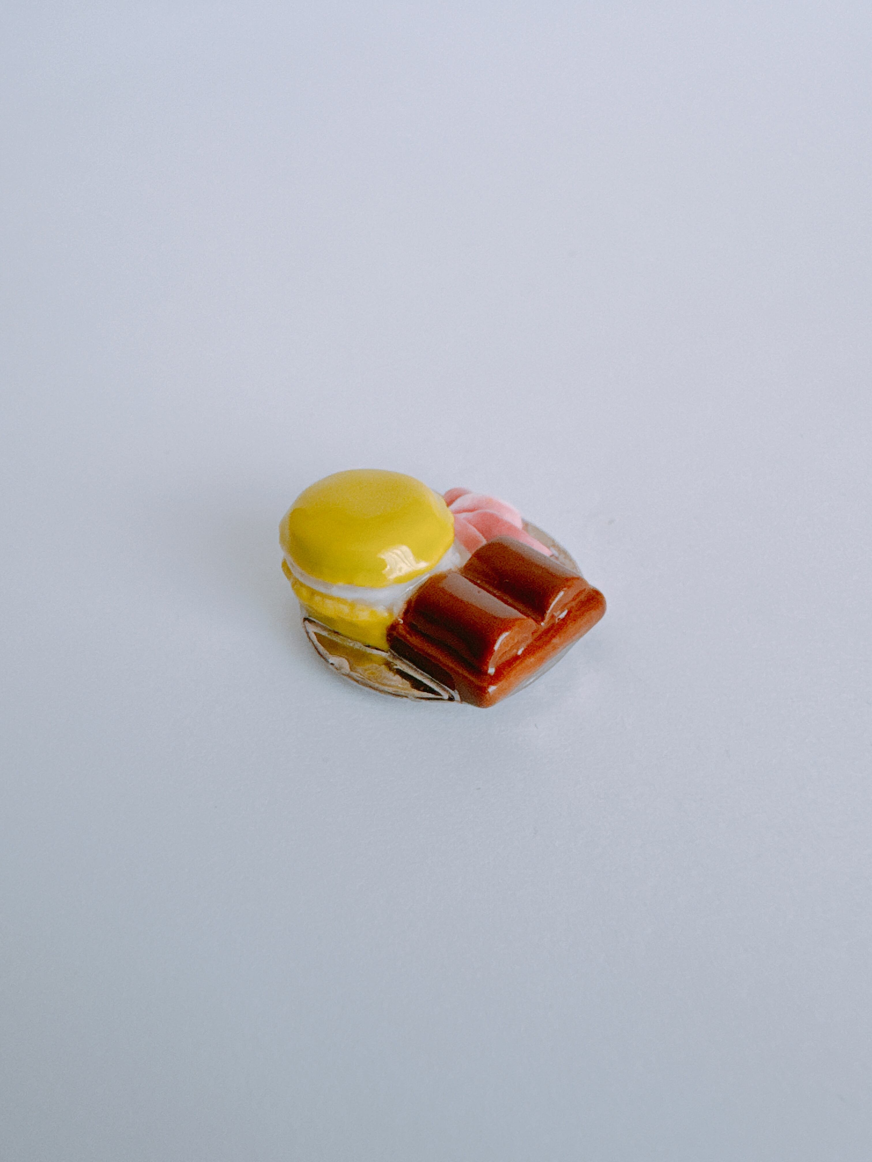 つややかなマカロンに、クラシックな板チョコレートとメレンゲを添えたプレート。