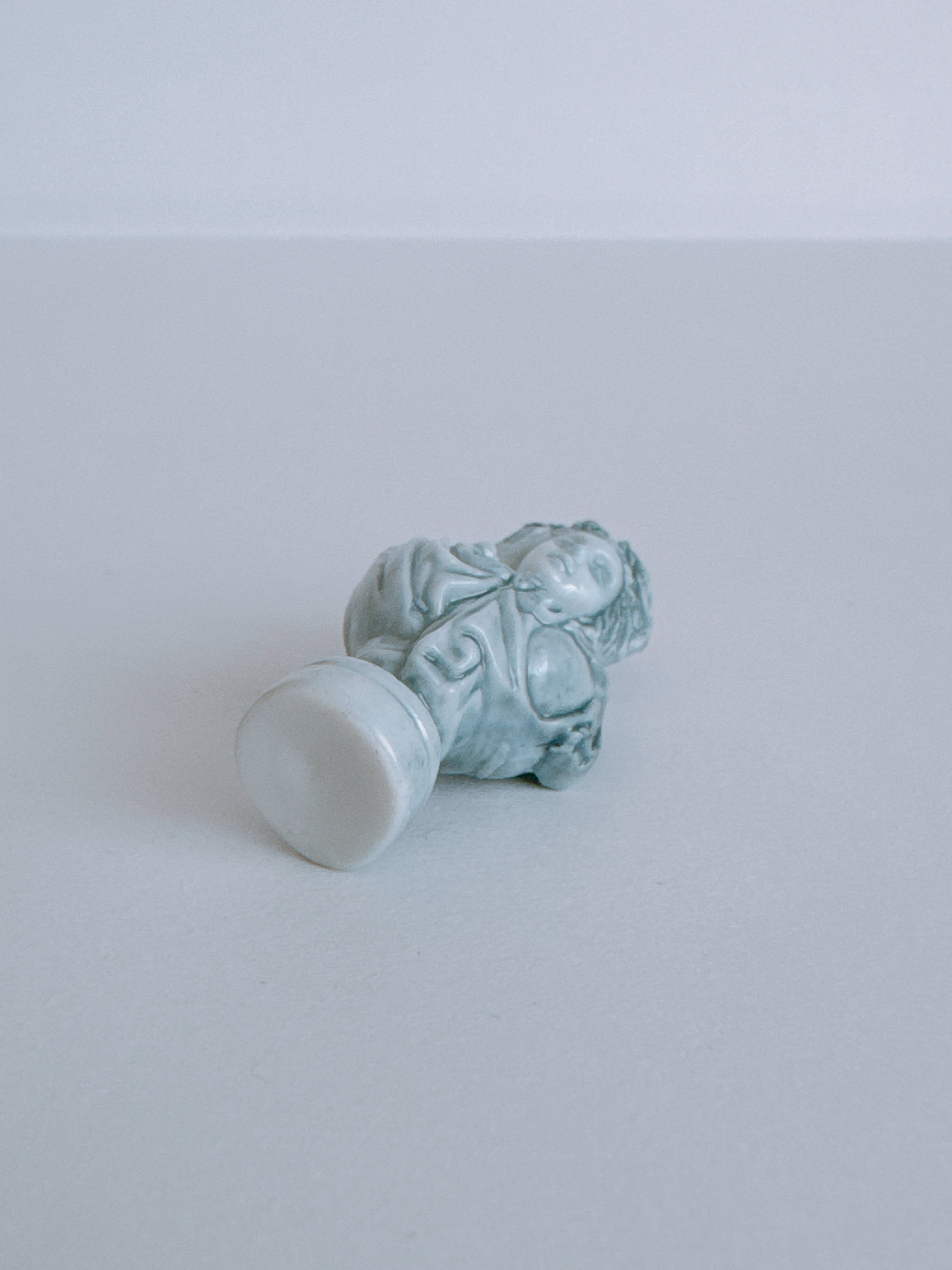 流れるような髪と装飾が印象的で、淡いブルーの釉薬がやさしく光を受け、気品をまとっています。