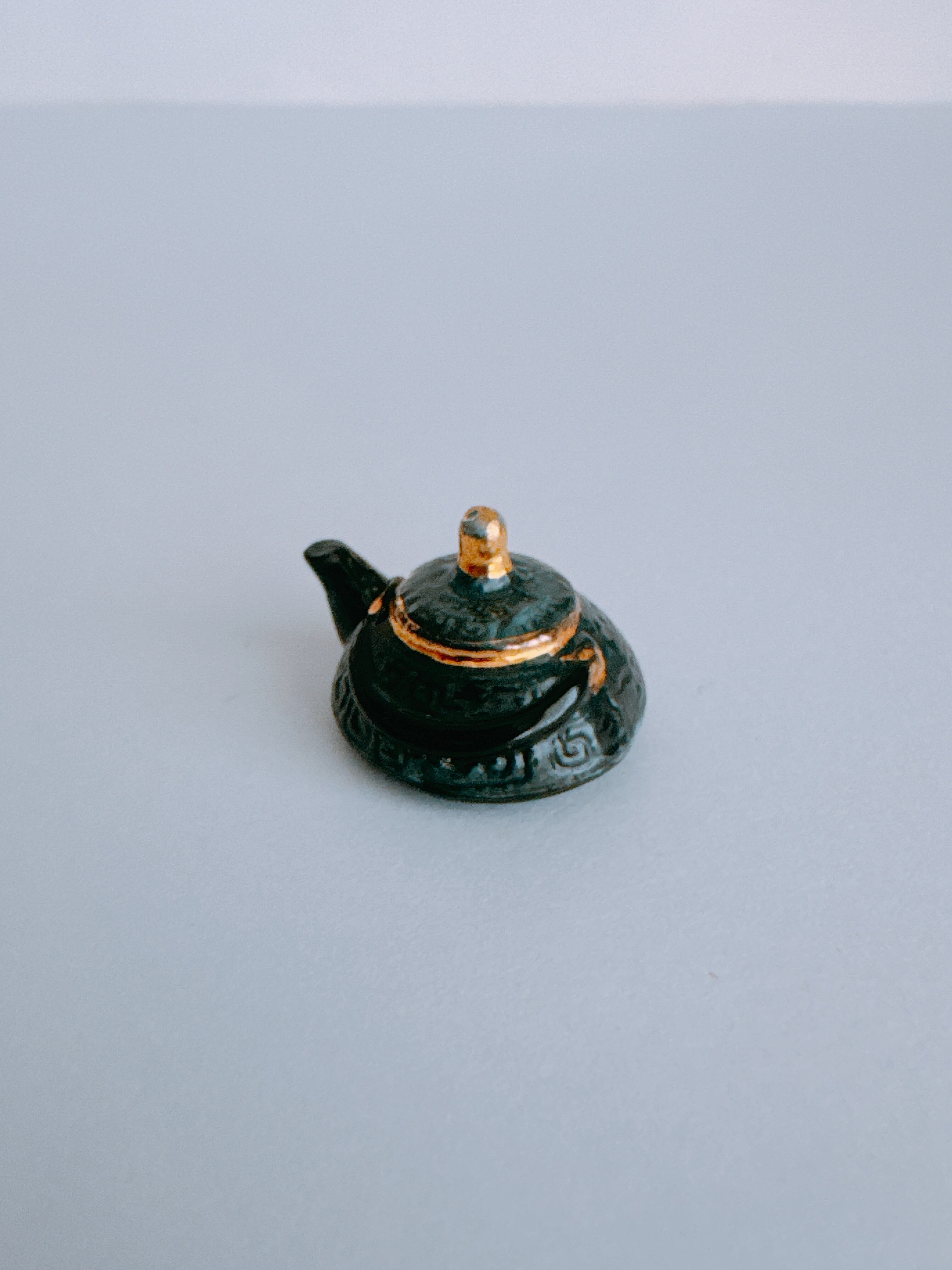 アジアの趣を感じさせる、落ち着いた黒に金のアクセントが美しいティーポット。