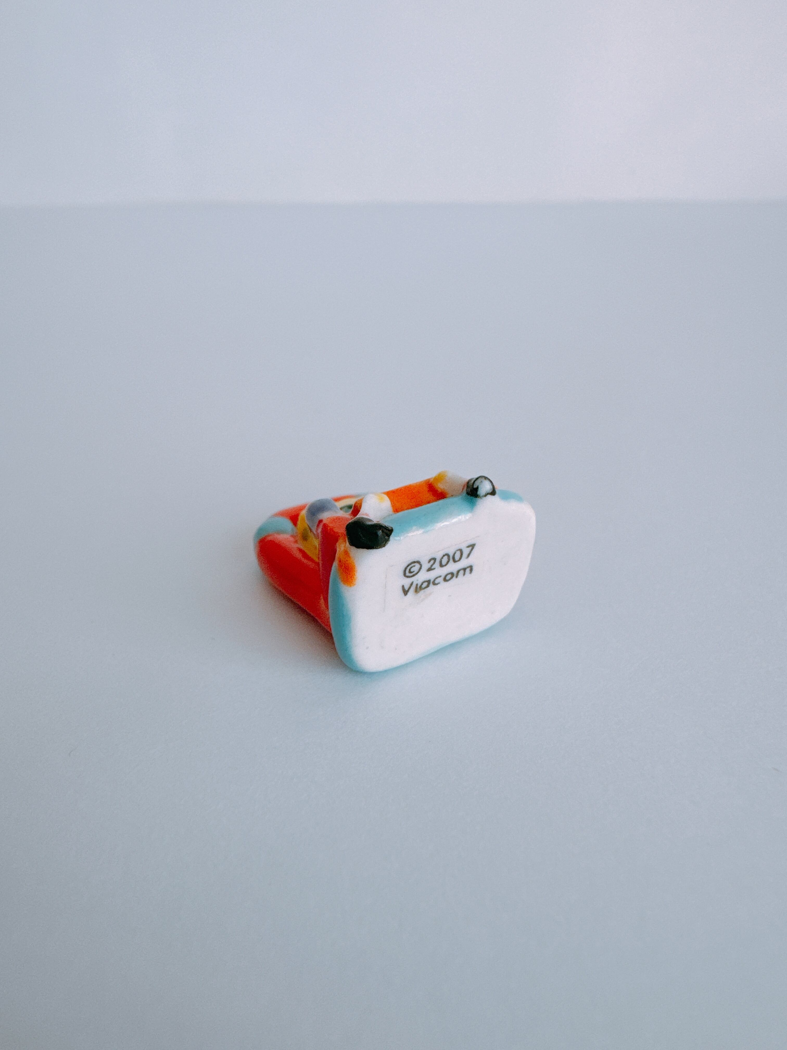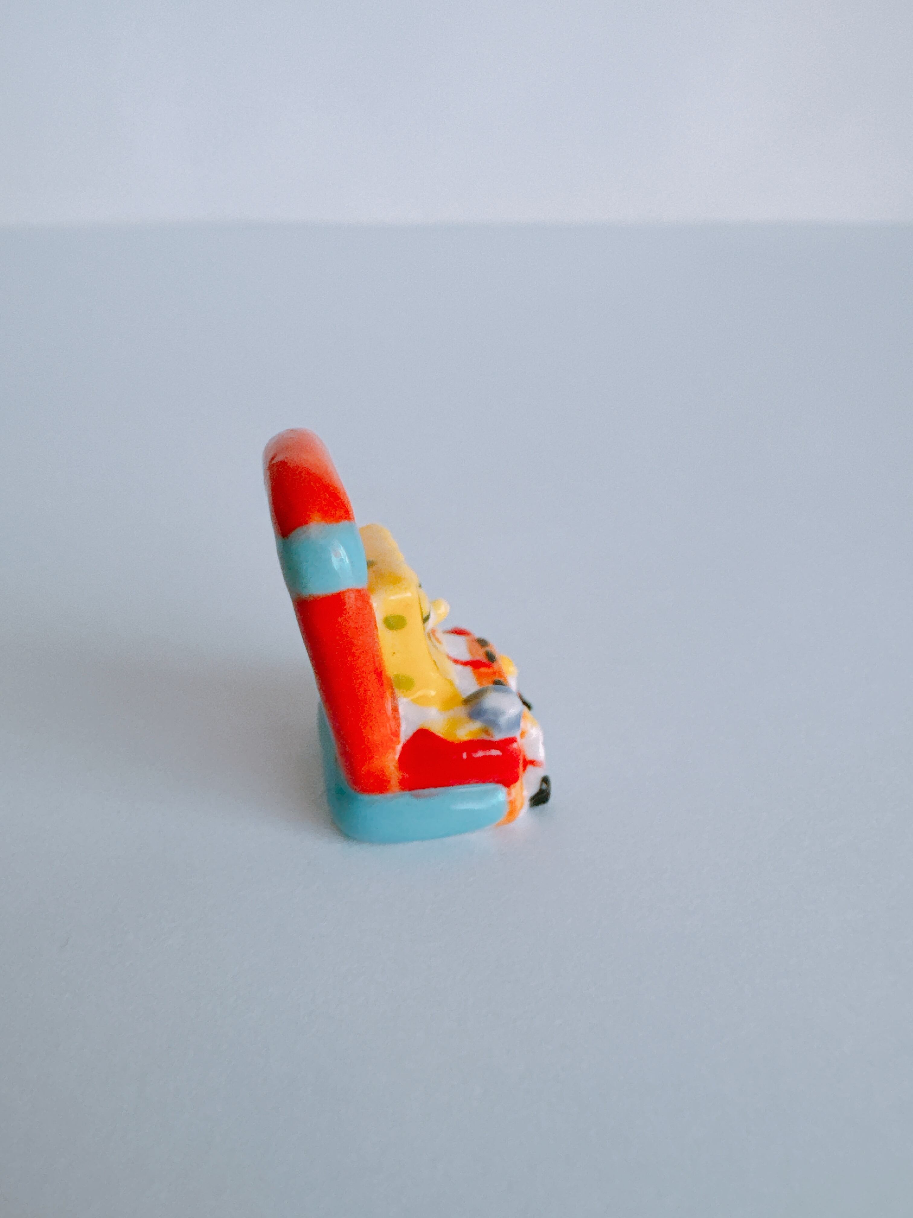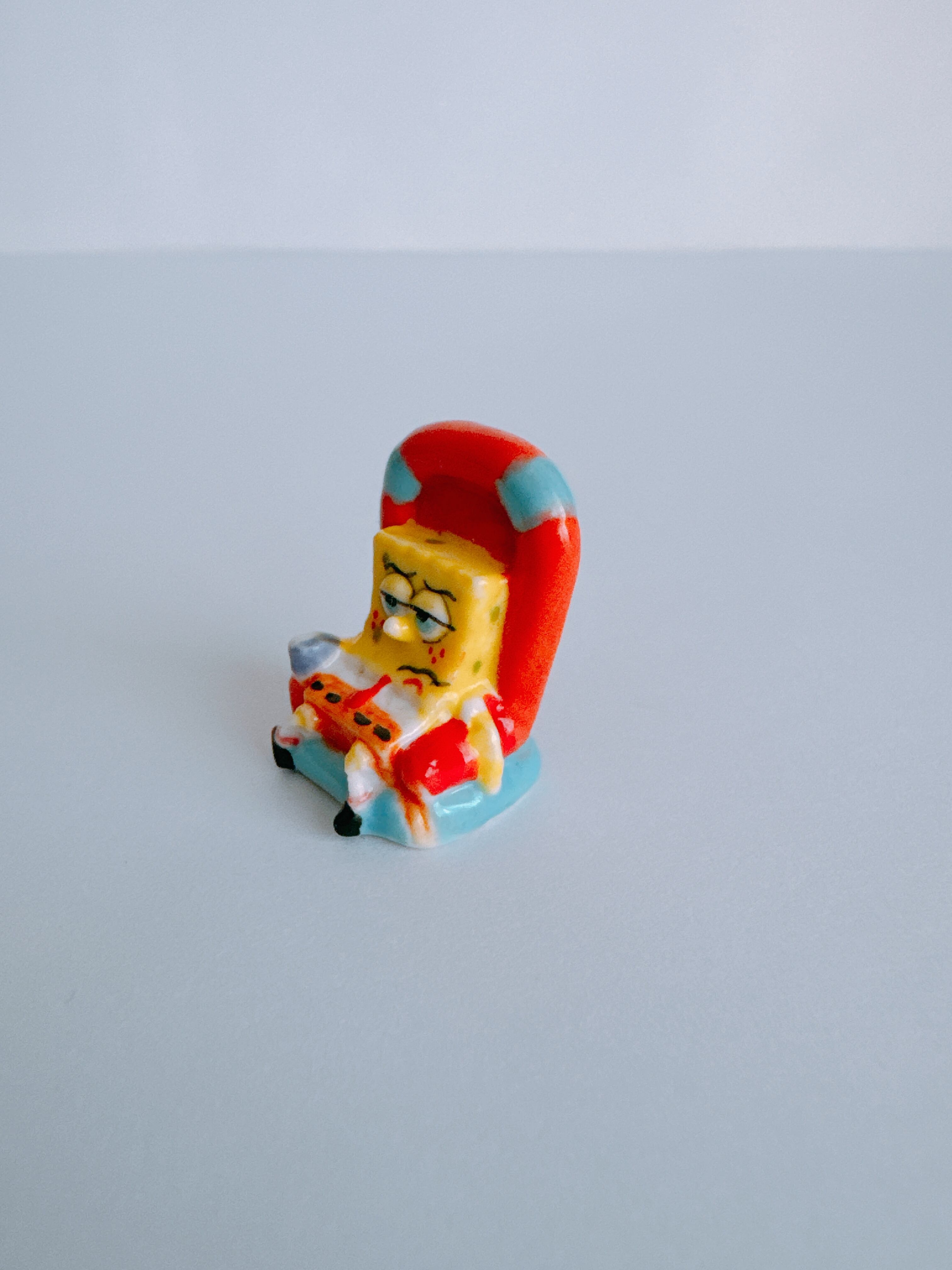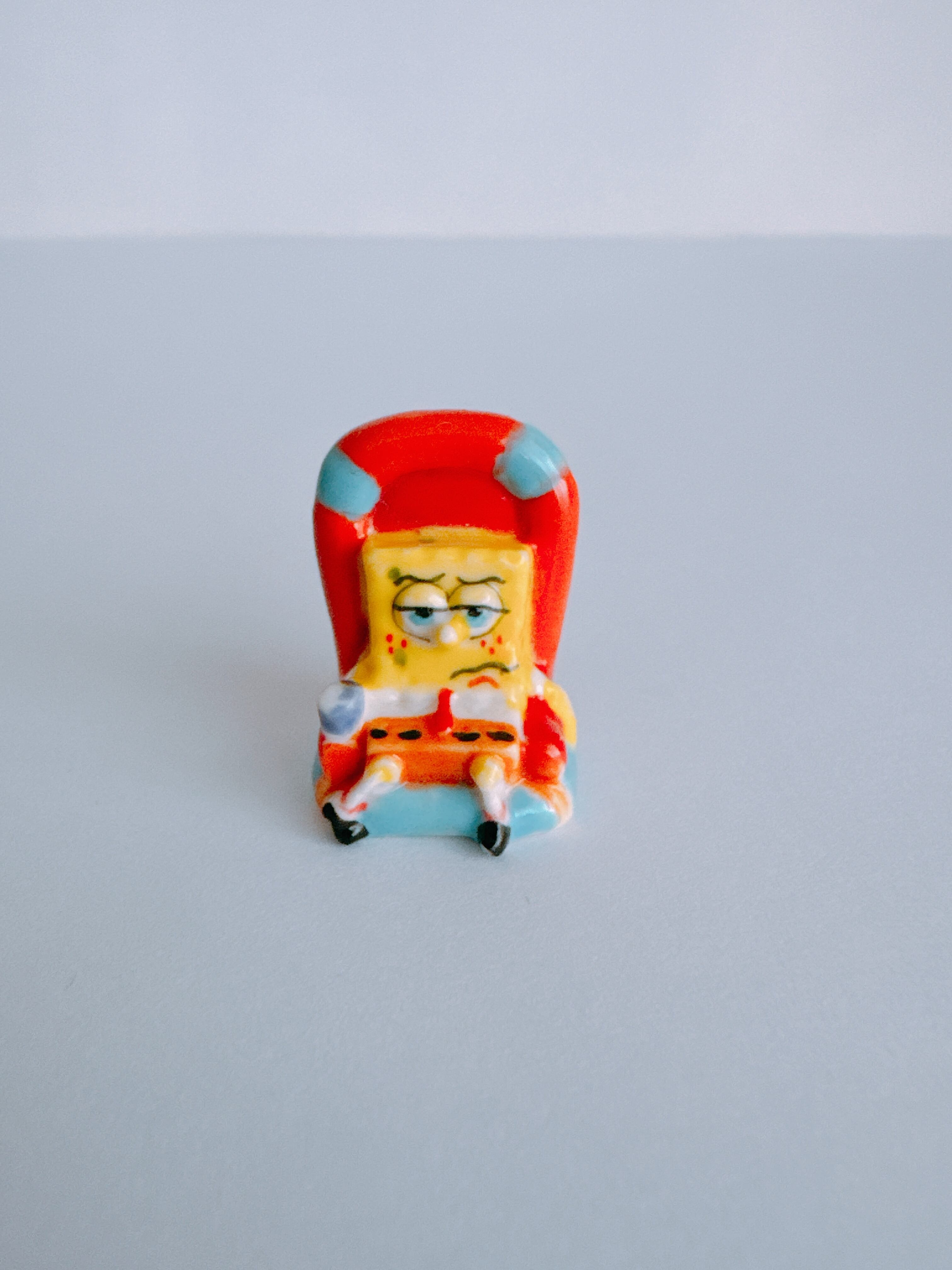 深く腰掛けたアームチェアに身をゆだね、どこか気だるげな表情を浮かべるスポンジボブ。