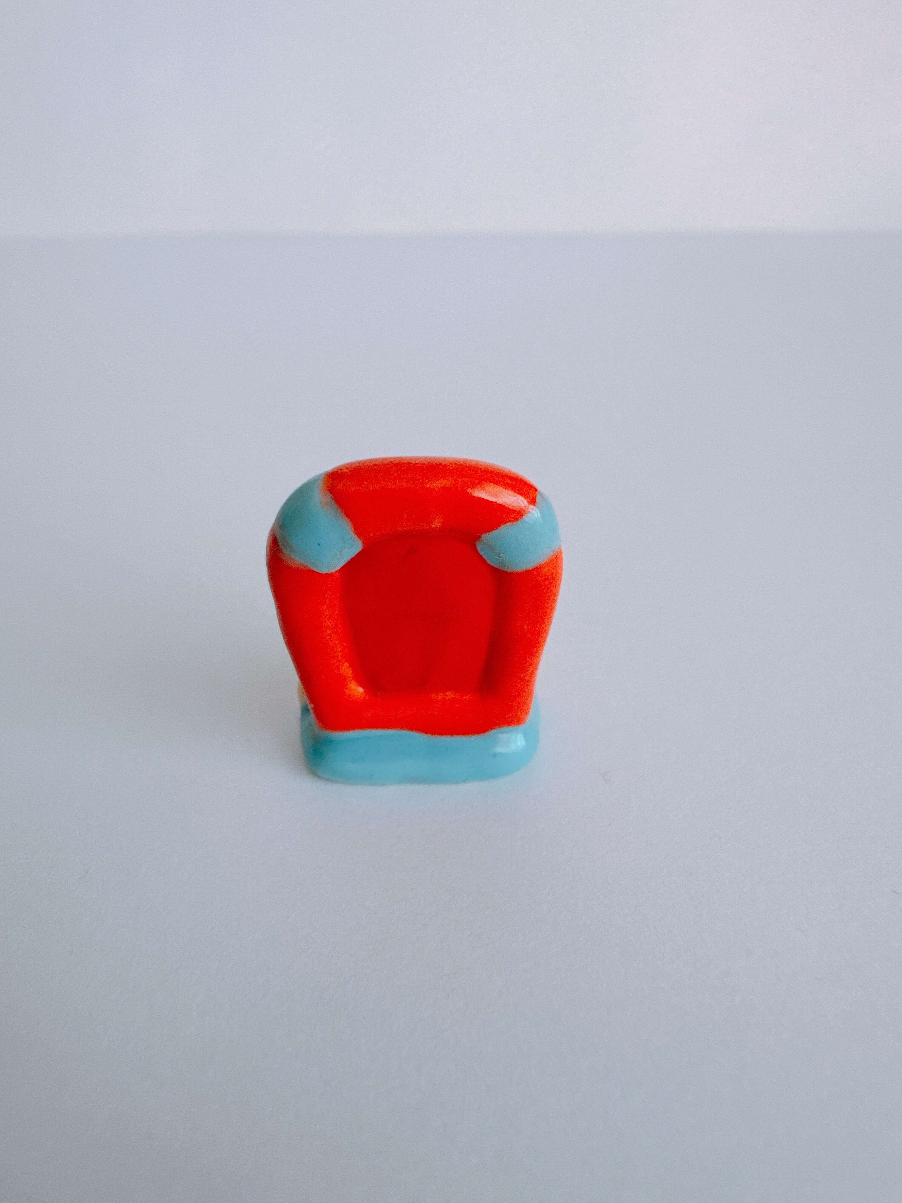 赤いチェアのフォルムと、脱力したような仕草が印象的で、遊び心のある世界観を感じさせます。