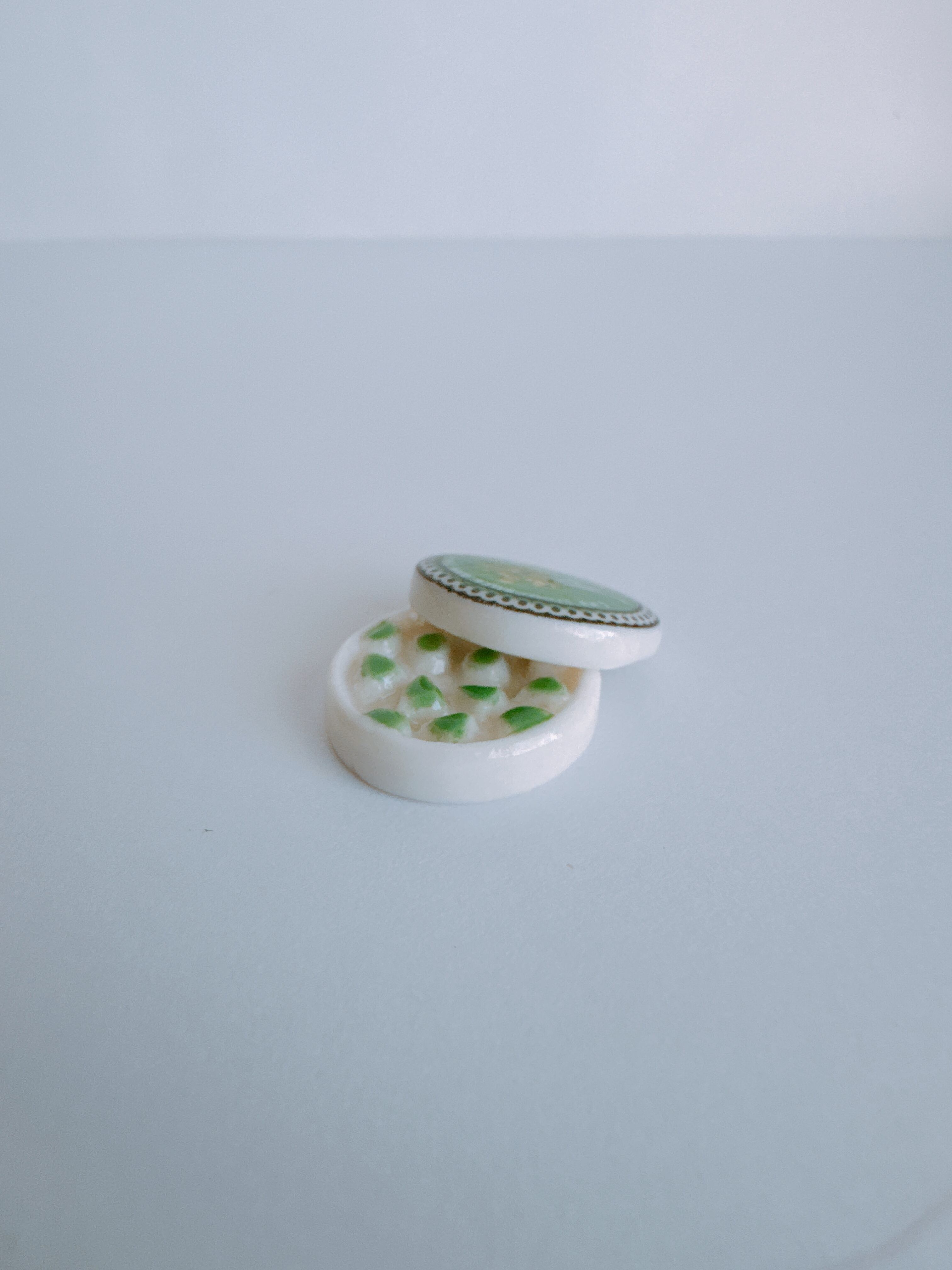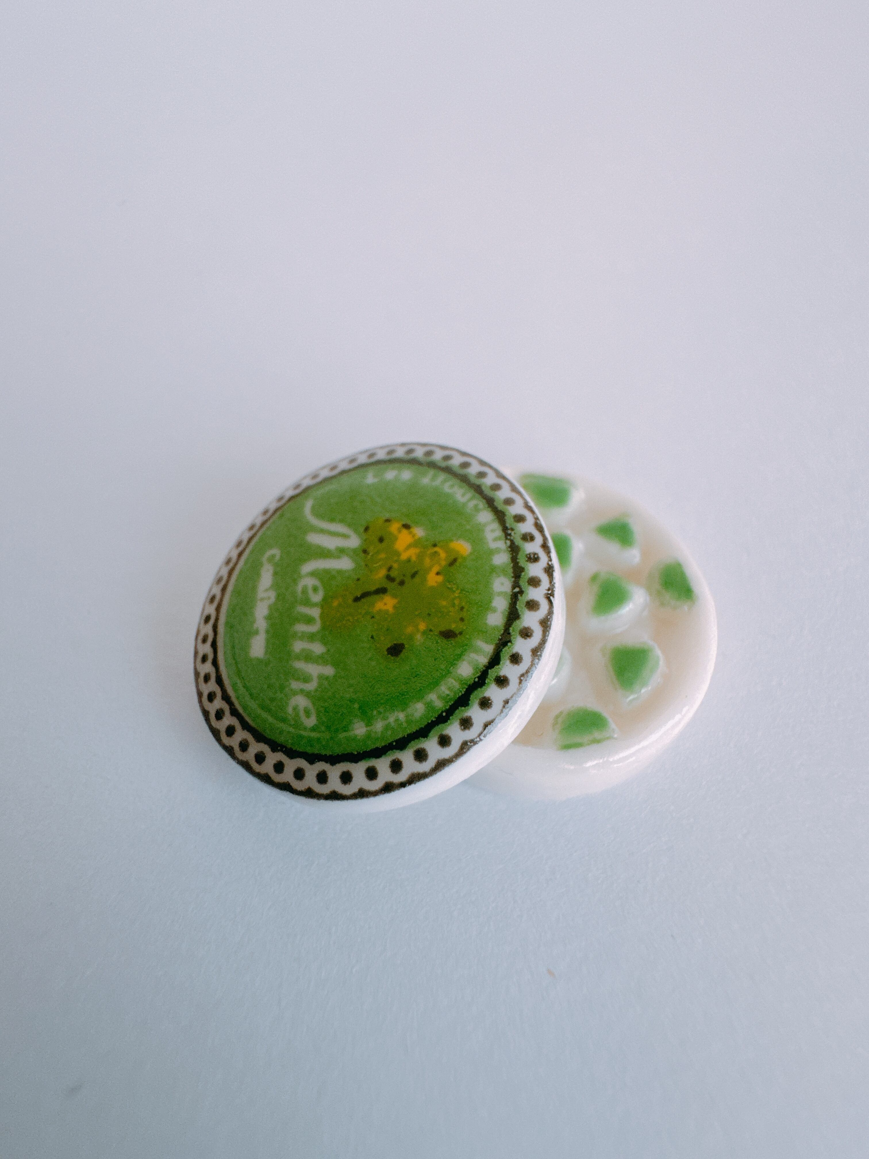 クラシックなミントタブレットの缶をかたどったフェーヴ。